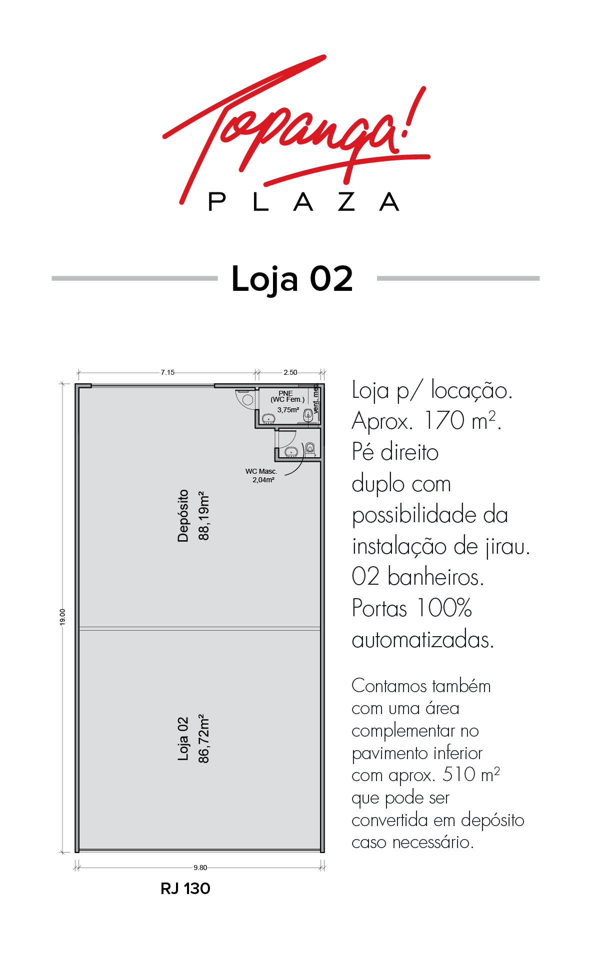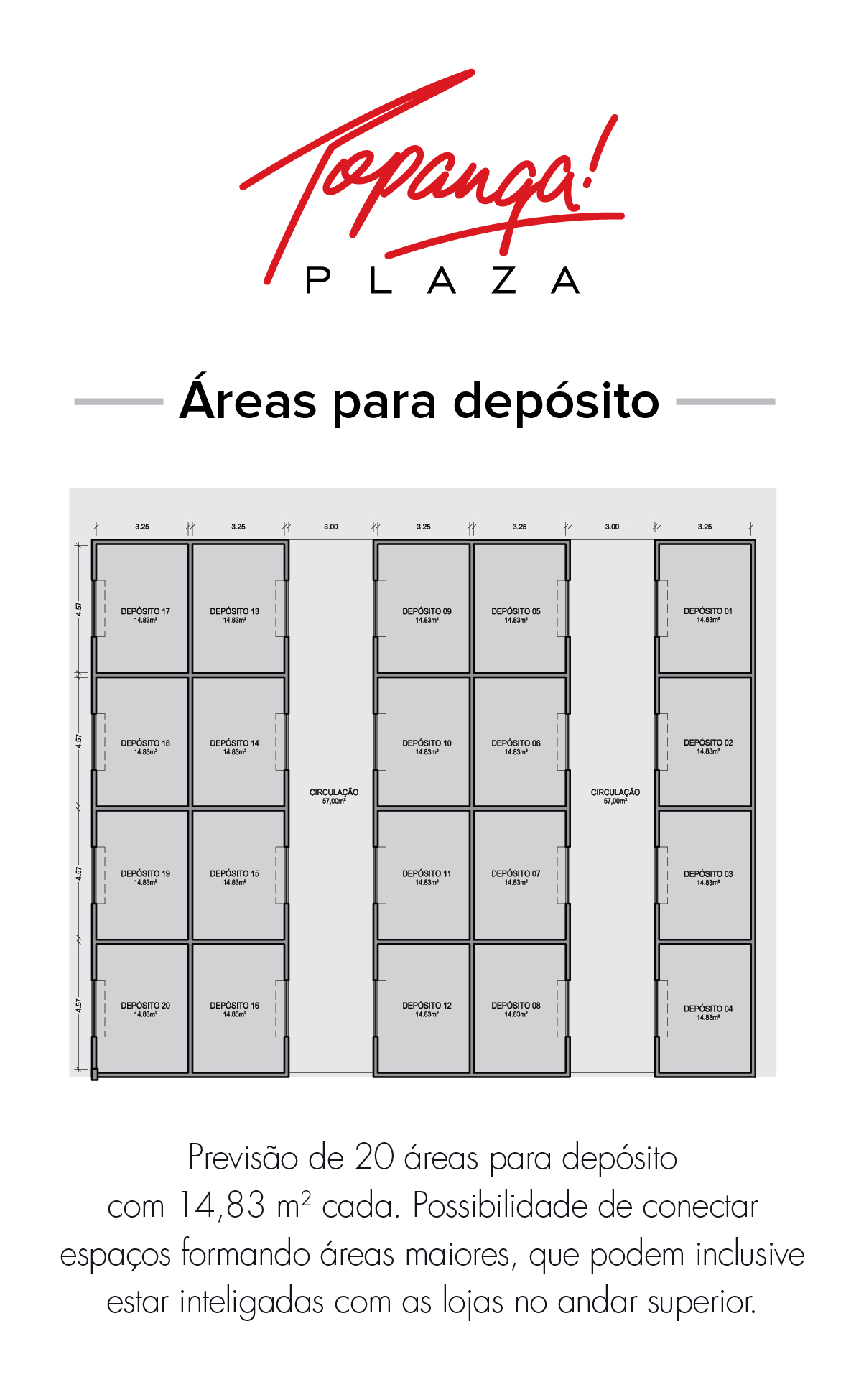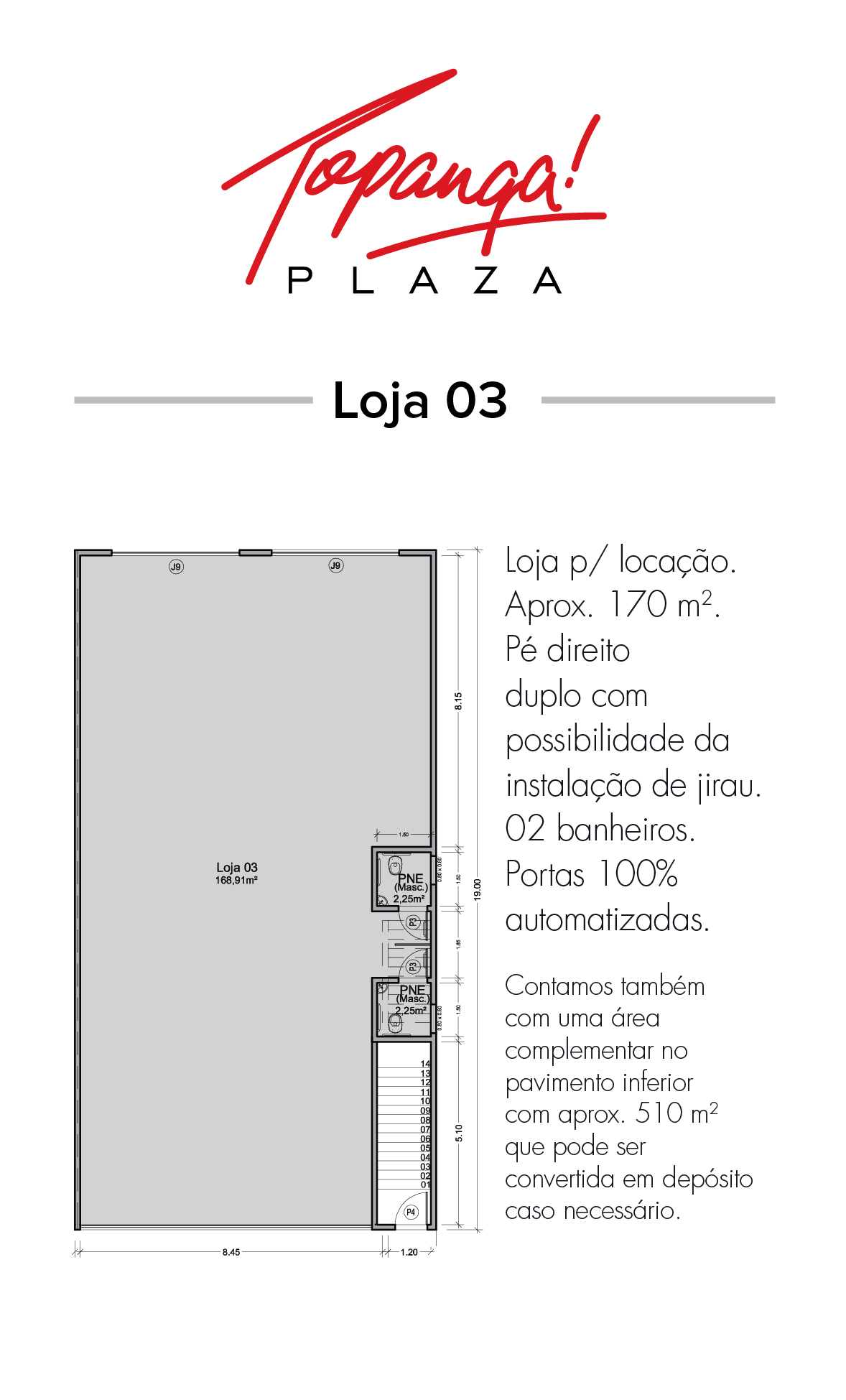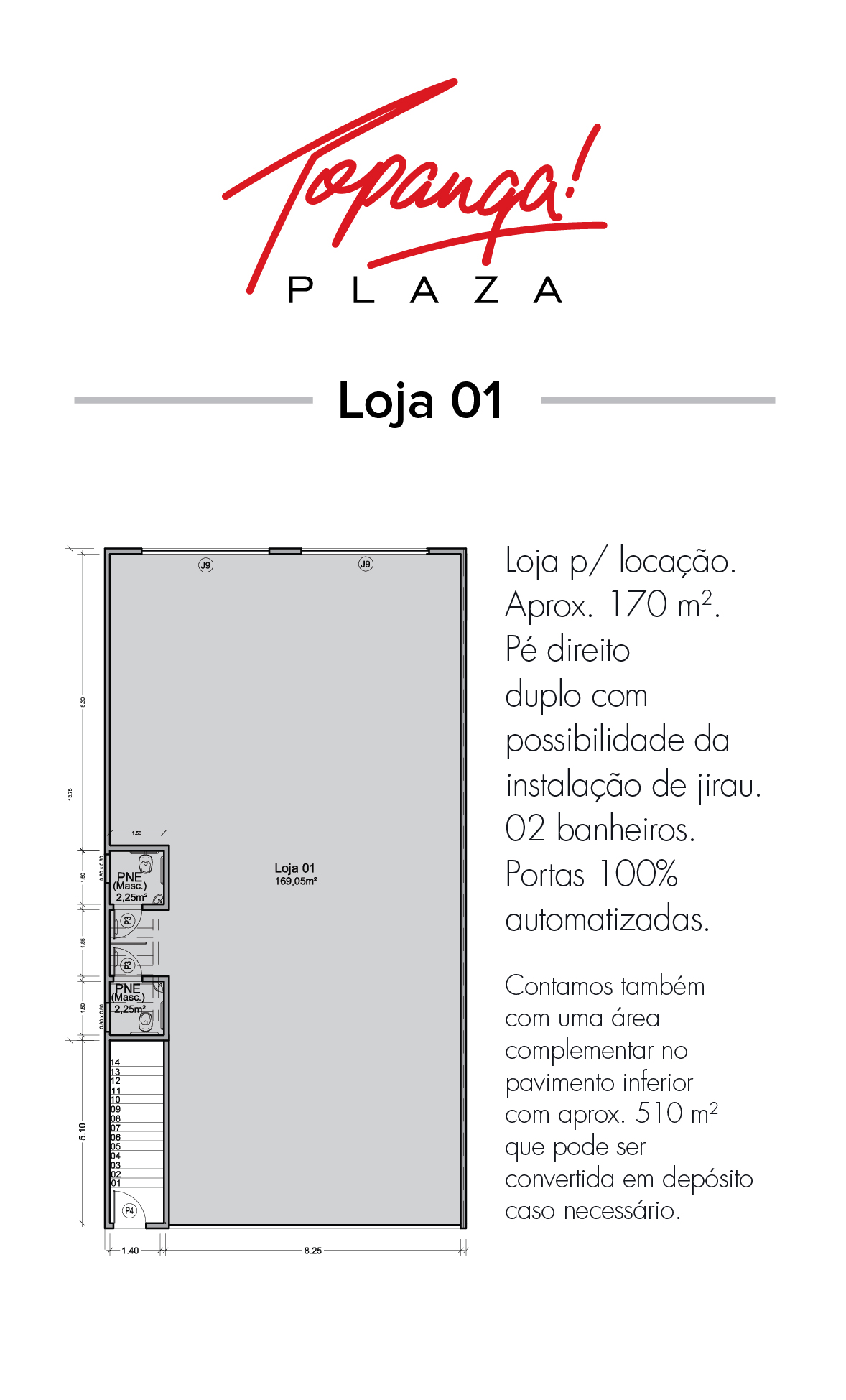 Contamos também com uma área complementar no pavimento inferior com aprox. 510 m2 que pode ser convertida em depósito caso necessário.