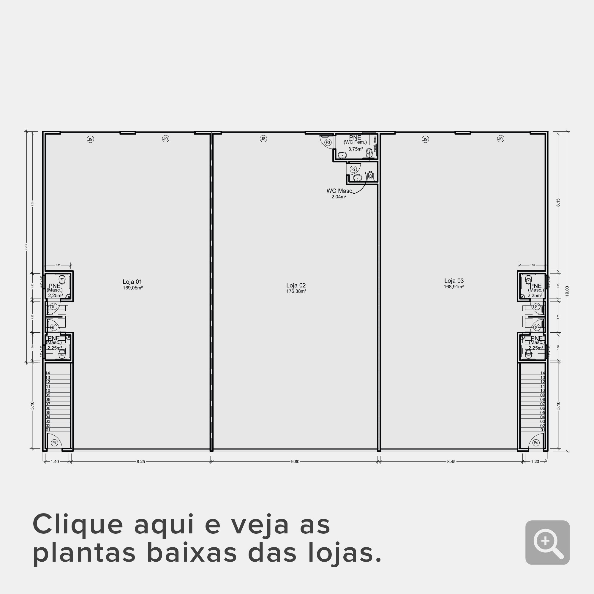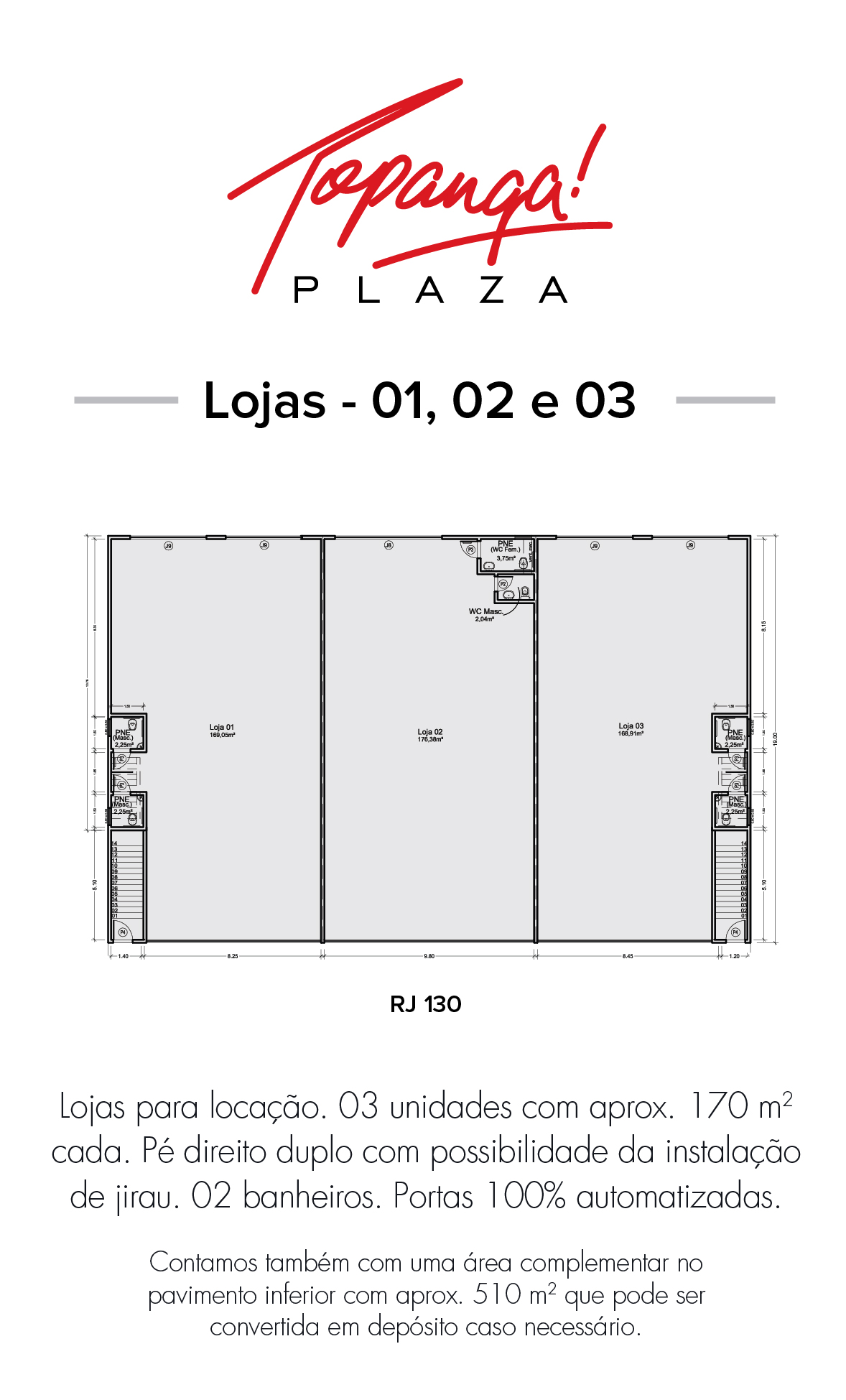 Lojas para locação. 03 unidades com aprox. 170 m2 cada. Pé direito duplo com possibilidade da instalação de jirau. 02 banheiros. Portas 100% automatizadas.